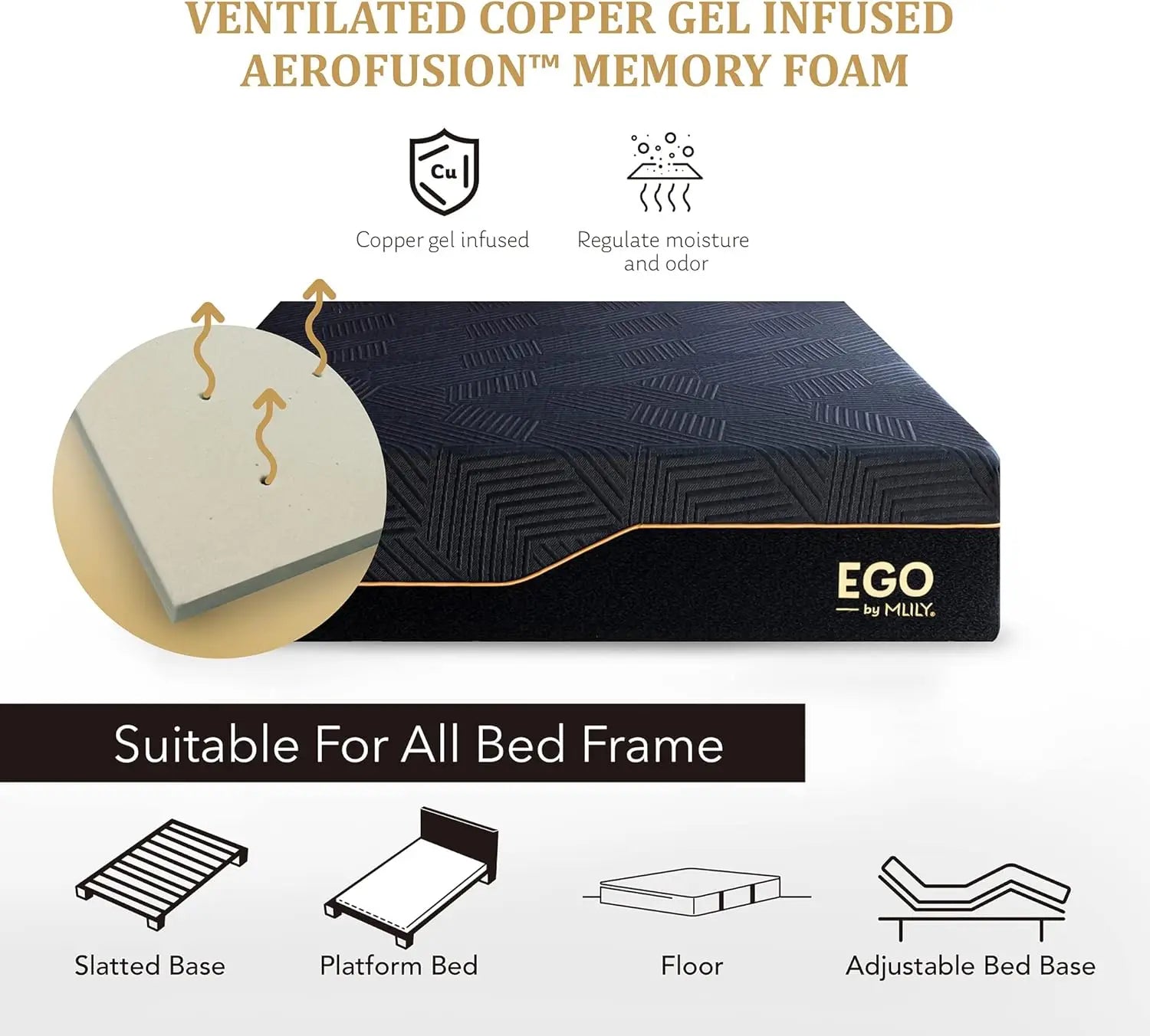 - Most Advanced Memory Foam by MLILY: The top layer- Cooper gel aerofuion memory foam regulate moisture and odor, reducing your risk of skin disease and ensuring a cleaner sleep environment for a healthier sleep and better you. And MLILY Adaptifoam boosts breathability and airflow with latex-free rebound.And the high density base foam will better support your neck, shoulder and give you a comfort sleep.